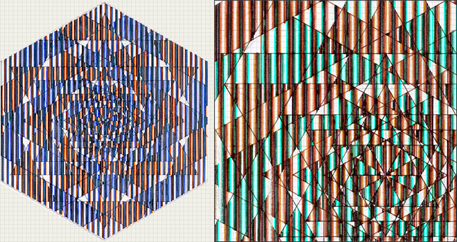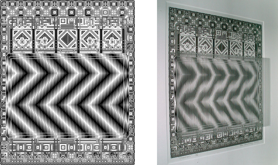 The name moire refers to watered mohair or silk, and has come to name periodic grids and linear meshes which make interference patterns when two or more are superimposed. There are many scientific, technical and artistic uses. Having seen the work of Victor Vasarely, Jesus Soto and other Op artists of the 1950s I started working with kinetic moire in 1965 while a student at Nottingham School of Art where Bridget Riley was a visiting tutor. I systematised the movements at first by hand with ink, compasses and ruling pens as seen here, and scaled up with paint and masking tape. At the Slade I used reeded Perspex to animate silkscreened stripes cut and glued into sequences. In 1982 Tarquin Publications published my book on moire movements, which explained methods for children and young adults, and my interest was again renewed when desktop printing and stencilled sandblasting enabled greater precision.