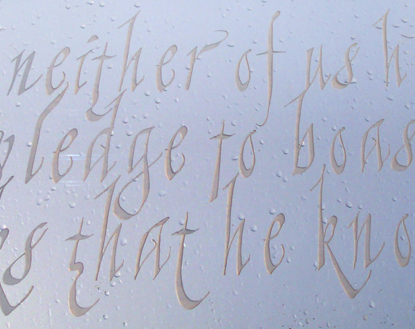 Example of sandblasted lettering. The alphabet was scanned; then the stencil was cut by machine.