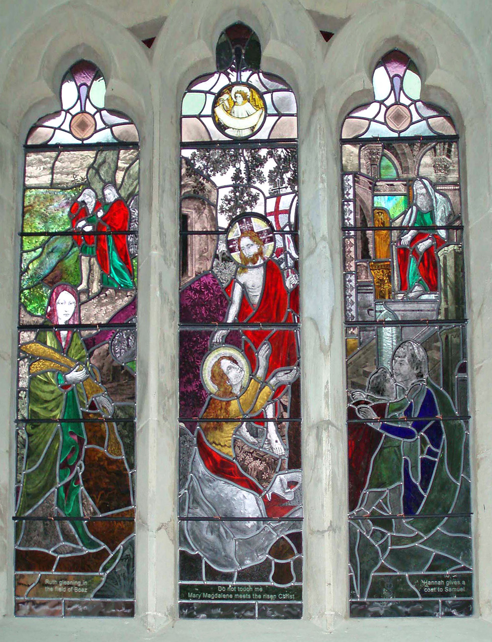 The three lights depict Biblical stories featuring the roles of three women. Ruth and Hannah are from the Old Testament. Mary Magdalene is from the New, and plays her part in the essential Christian story of the Resurrection.