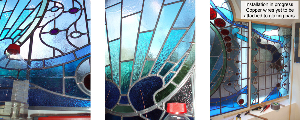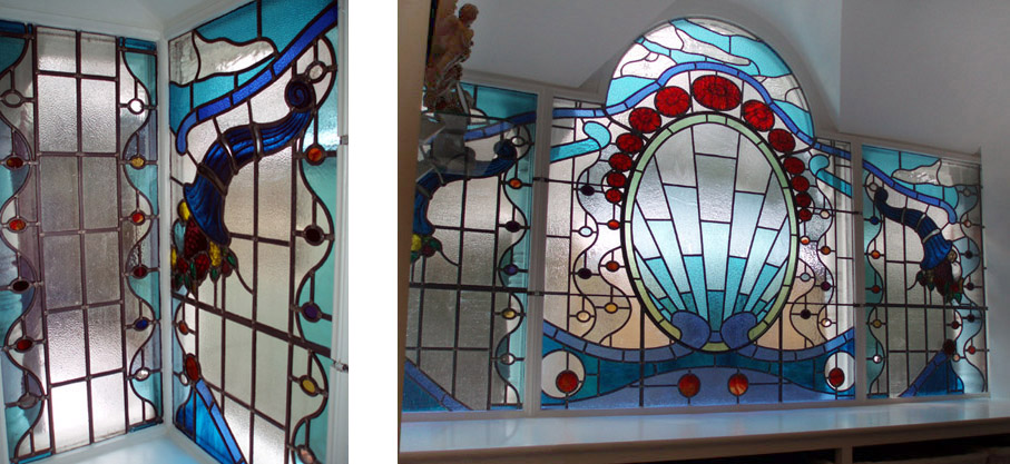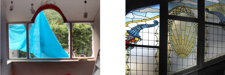 Iron glazing bars by Ron Halls, F.J.Halls and Son, The Forge, Molehill Green, Takeley, Bishop's Stortford, Herts. CM22 6PQThe clients incorporated a porch into a room and wanted stained glass designed after a window in Lyon, France, artist unknown, shown below.
