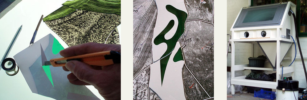 Stencils may be cut by hand or digital cutter. They are used as masks for painting, staining, enamelling, screenprinting, sandblasting or etching when sharp edges are required.